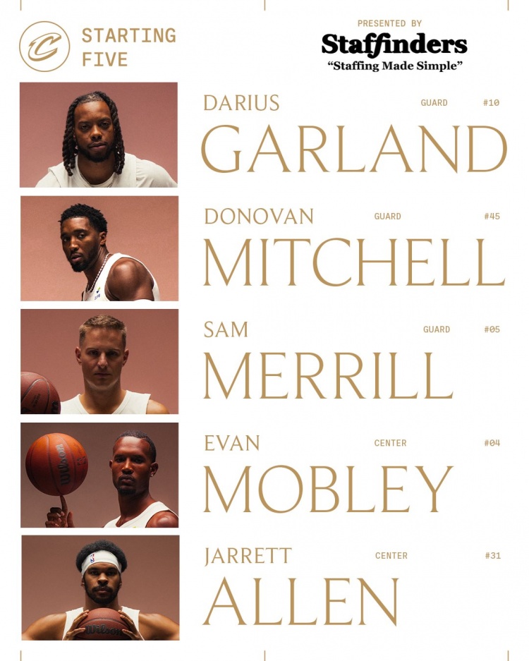 骑士首发:加兰、米切尔、梅里尔、莫布里以及贾勒特·阿伦。