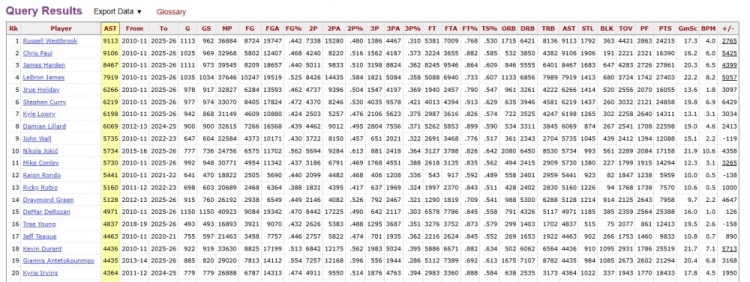 1月15日讯 NBA常规赛,国王在主场以112-101击败尼克斯。此役,威少出战39分11秒,投篮13中6,三分6中2,罚球7中5,得到19分6篮板11助攻。据统计,10-11赛季至今,威少以9124次助攻领跑全联盟,保罗(9106助)和哈登(8467助)分列二三位。今日赛前数据: