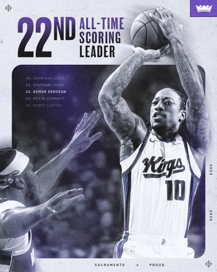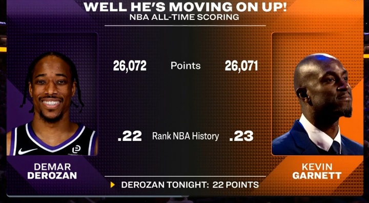 里程碑!德罗赞生涯总得分超越加内特 升至NBA历史第22位!