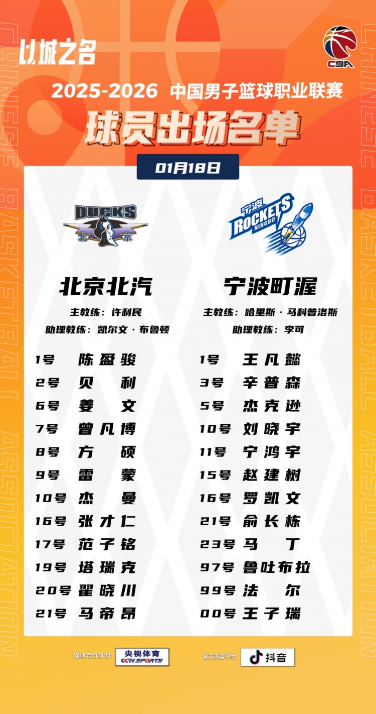 1月18日讯 19:35北京将在主场迎战宁波,赛前大名单出炉。北京:陈盈骏、贝利、姜文、曾凡博、方硕、雷蒙、杰曼、张才仁、范子铭、塔瑞克、翟晓川、马帝昂。宁波:王凡懿、辛普森、杰克逊、刘晓宇、宁鸿宇、赵建树、罗凯文、俞长栋、马丁、鲁吐布拉、法尔、王子瑞。