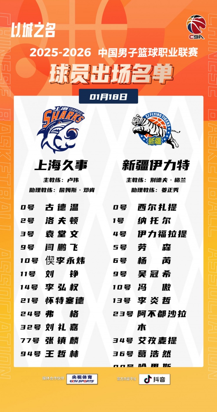 1月18日讯 今晚19:35,上海主场迎战新疆,赛前大名单出炉。上海:古德温、洛夫顿、袁堂文、闫鹏飞、偰李永炜、刘铮、李弘权、怀特塞德、弗格、刘礼嘉、张镇麟、王哲林。新疆:西尔扎提、纳托尔、伊力福拉提、劳森、杨芮、吴冠希、冯傲、李炎哲、阿不都沙拉木、艾孜麦提、葛浩然、哈里斯。