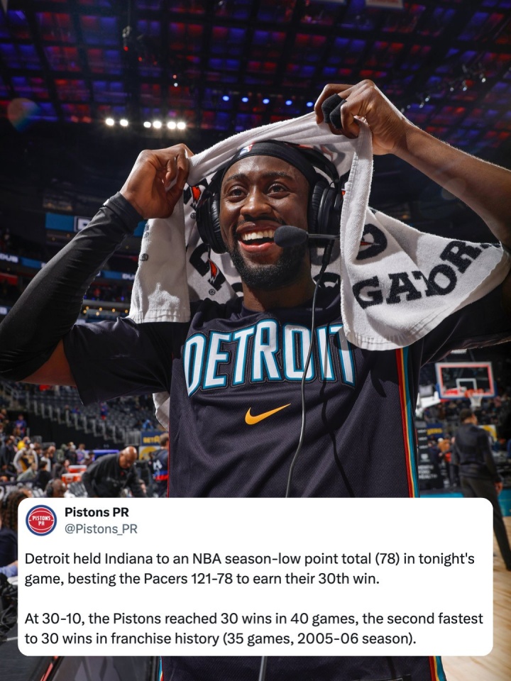 稳居东部第一!活塞赛季前40场比赛拿到30胜 队史第二快!