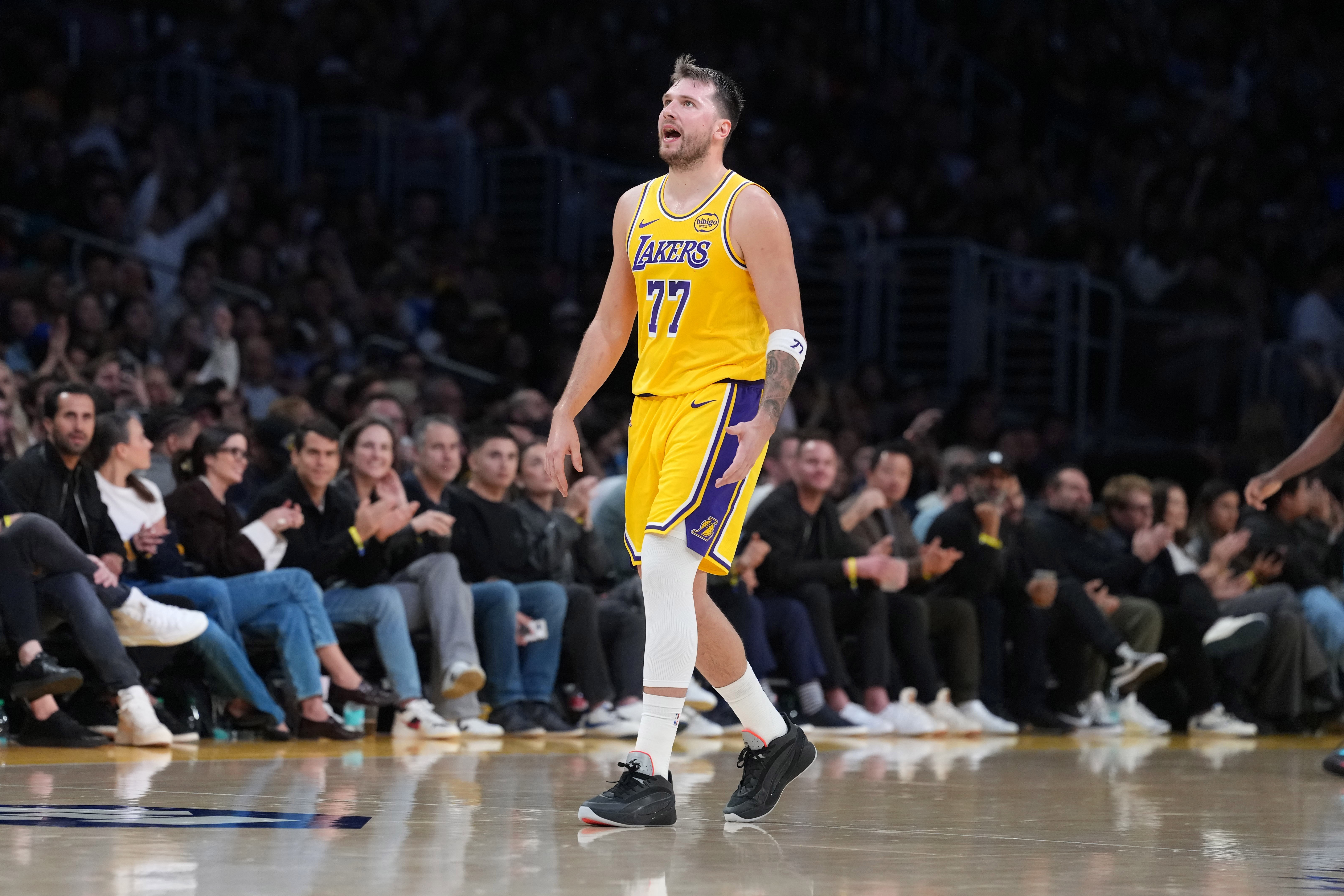 1月19日讯 NBA常规赛,湖人上半场以55-54领先猛龙。上半场比赛,东契奇在复出后火力全开,他出战18分53秒,投篮14中5,三分8中4,罚球4中4,得到18分1篮板5助攻,但被吹罚了一次技术犯规。中场时刻,东契奇还投中了一记不讲理压哨三分。GIF-东契奇不讲理压哨三分