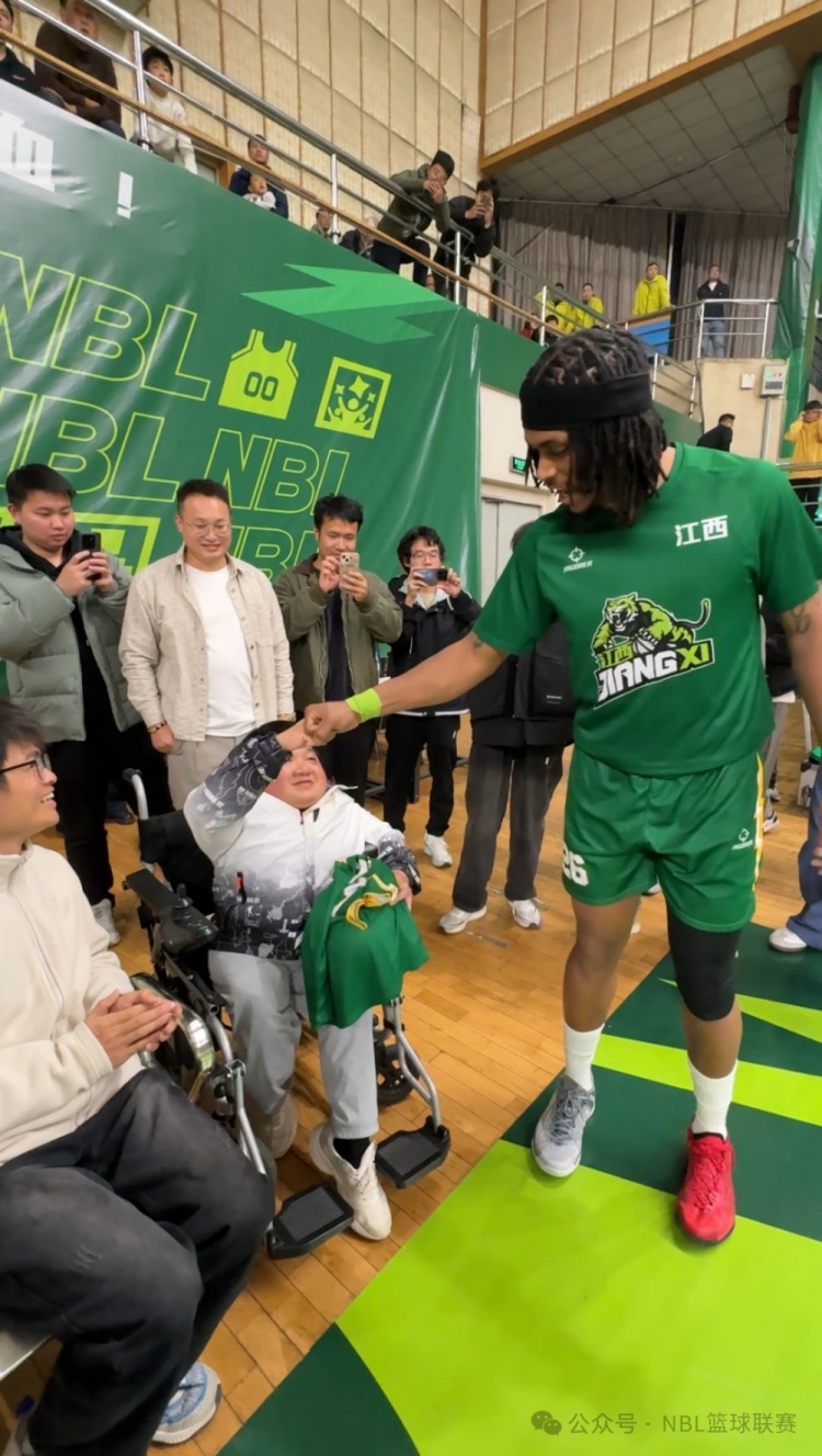 江西鲸裕清酒队球员尼文-格洛弗走到他身边,将签满全体队员名字的球衣和篮球赠予这位特殊球迷。两人以拳对拳相互鼓励,完成了一次跨越身体限制的“击掌”。
