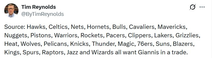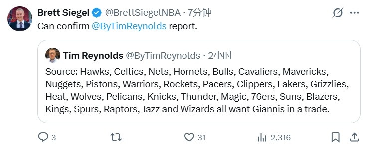 1月23日讯 据美联社知名记者Tim Reynolds报道,消息人士透露,联盟所有其余29支球队都有意交易得到雄鹿球星字母哥。该记者推文具体为:“消息来源透露,老鹰、凯尔特人、篮网、黄蜂、公牛、骑士、独行侠、掘金、活塞、勇士、火箭、步行者、快船、湖人、灰熊、热火、森林狼、鹈鹕、尼克斯、雷霆、魔术、76人、太阳、开拓者、国王、马刺、猛龙、爵士和奇才都想通过交易得到扬尼斯。”ClutchPoints名记Brett Siegel转发此报道表示:“可以确认属实。”