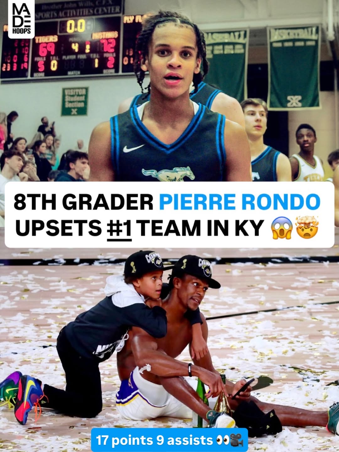 在这场爆冷之战中,8年级的皮埃尔·隆多表现出色,在父亲拉简·隆多现场观战之下,他全场11投7中砍下17分4篮板9助攻3抢断,仅有1次失误。