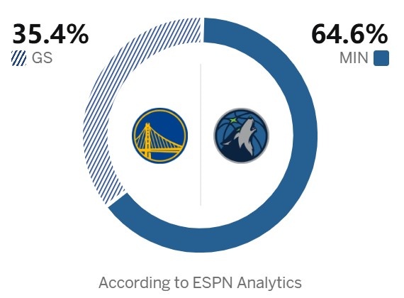 1月24日讯 明天上午6点30,勇士将在客场挑战森林狼。今天,ESPN预测本场比赛胜率,勇士35.4%,森林狼64.6%。目前,森林狼27胜18负西部第七,他们四连败;勇士25胜21负西部第八,在巴特勒报销后他们两连败。
