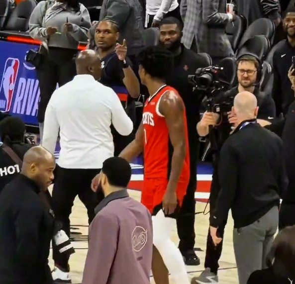 1月24日讯 NBA常规赛,火箭客场111-104战胜活塞。赛后,阿门·汤普森和奥萨尔·汤普森两兄弟聊天,聊完还相互指着对方。本场比赛阿门11中5砍下15分9篮板7助攻2抢断,奥萨尔8中5砍下12分8篮板3助攻2抢断。GIF-两人赛后聊天