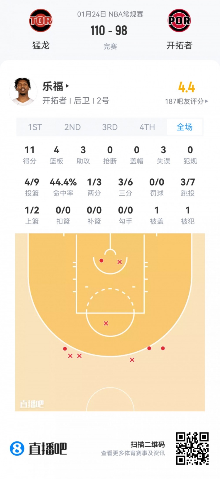 开拓者首轮16号秀杨瀚森 登场7.2分钟