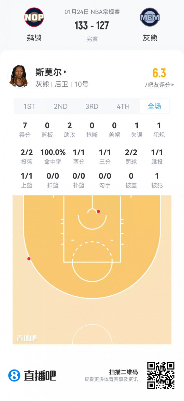 灰熊次轮48号秀贾冯·斯莫尔 登场8.7分钟