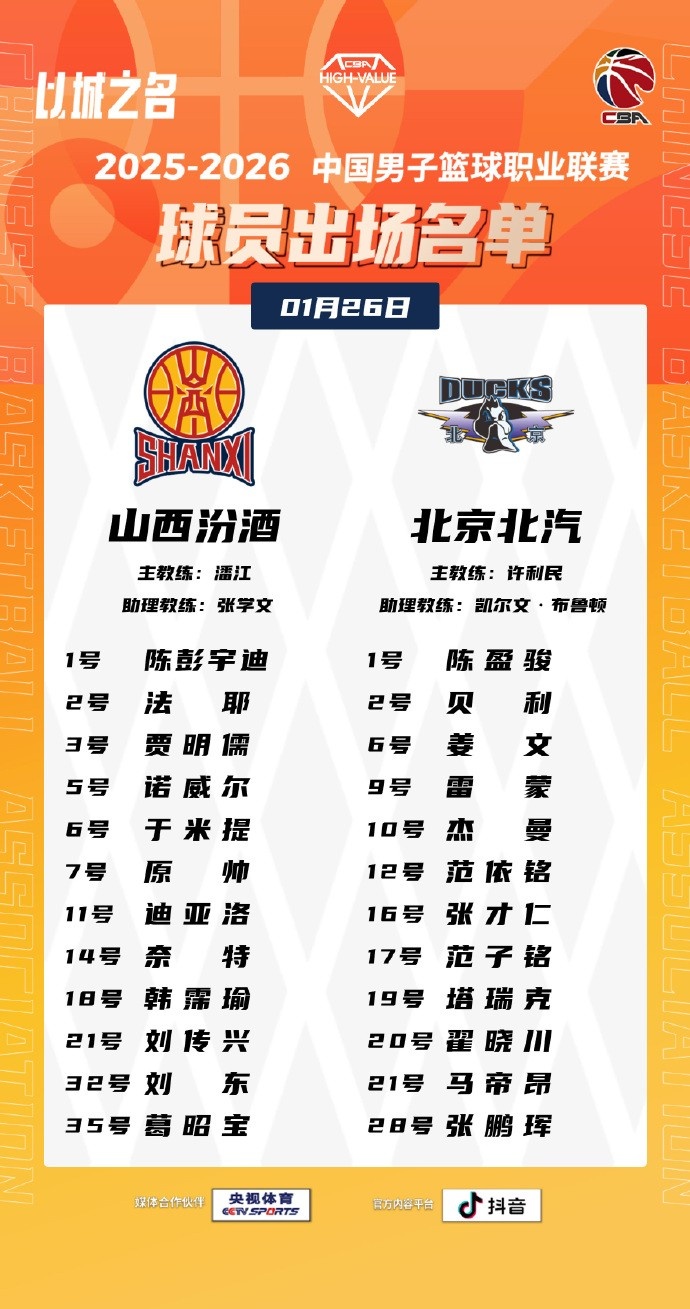1月26日讯 今晚19:35,山西主场迎战北京,赛前大名单出炉。山西:陈彭宇迪、法耶、贾明儒、诺威尔、于米提、原帅、迪亚洛、奈特、韩霈瑜、刘传兴、刘东、葛昭宝。北京:陈盈骏、贝利、姜文、雷蒙、杰曼、范依铭、张才仁、范子铭、塔瑞克、翟晓川、马帝昂、张鹏珲。