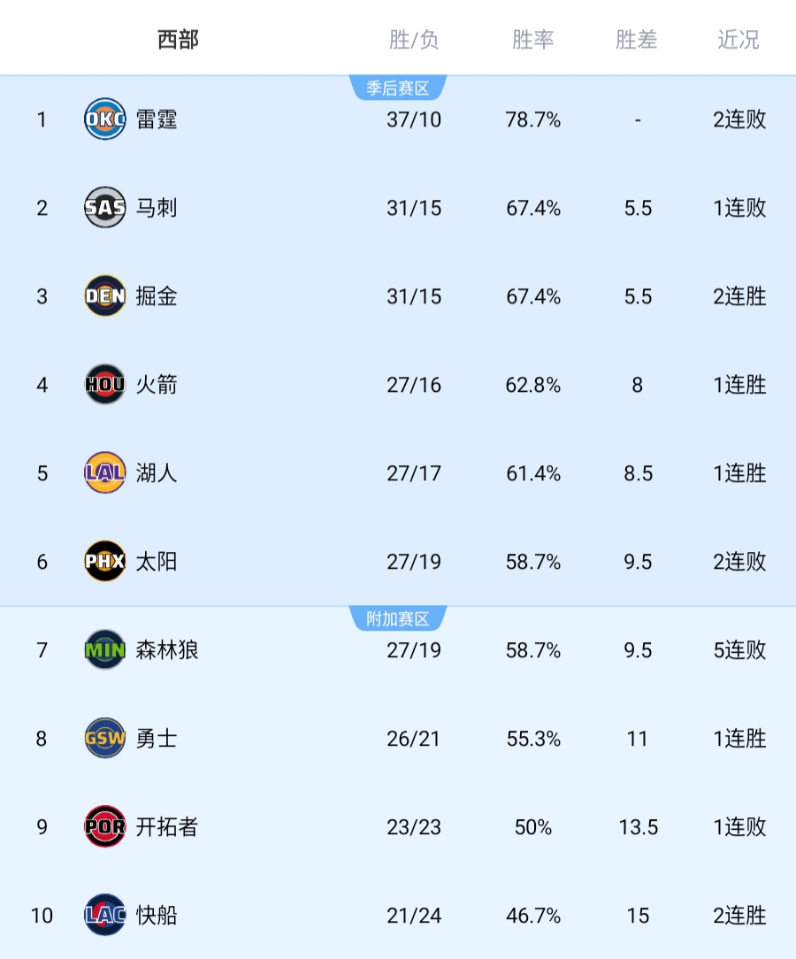01月26日讯 今日NBA常规赛,太阳主场102-111不敌热火。此役过后,太阳遭遇两连败,目前战绩27胜19负和森林狼持平&暂居西部第六。由于湖人昨日击败独行侠取胜,因此湖人和太阳之间的胜场差拉开一个胜场,湖人继续排名西部第五。湖人明天早晨9点,将继续自己的八连客之旅,客场挑战公牛。