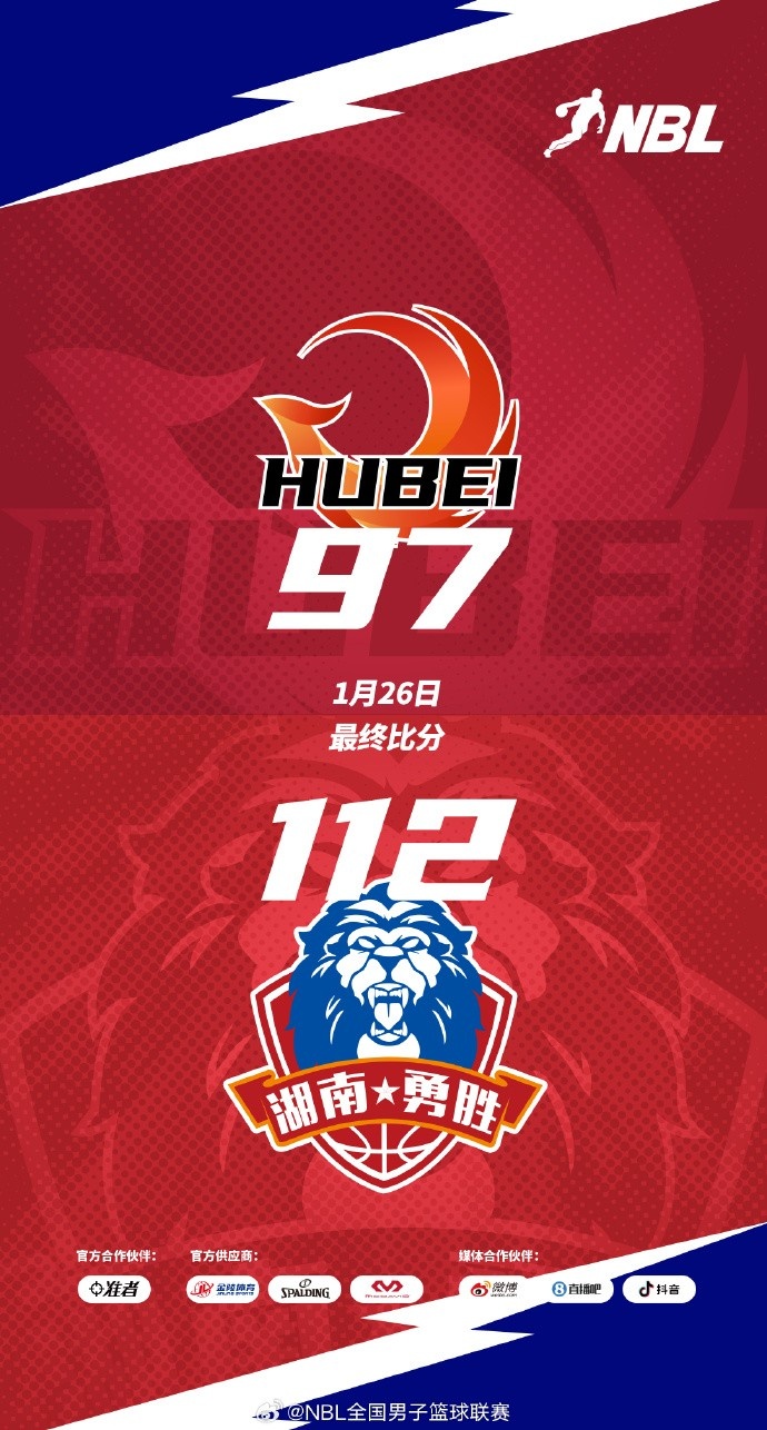【战报】2025-2026赛季NBL联赛第11场焦点战:湖北文旅97-112不敌长沙勇胜。贝利-斯蒂尔得到34分10篮板3助攻,王晓明得到28分2篮板3助攻;长沙勇胜这边,拉蒙·加洛韦得到29分10篮板4助攻,王庆明得到27分2助攻,史蒂芬·齐默尔曼得到24分14篮板5助攻。