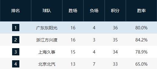 1月26日讯 CBA常规赛,广东98-89力克天津。此役过后,广东收获四连胜,本赛季战绩来到16胜4负,总积分上升为36,以1分优势超过广厦,升至榜首!按球队比赛积分来排列常规赛总名次,胜1场积2分,负1场积1分