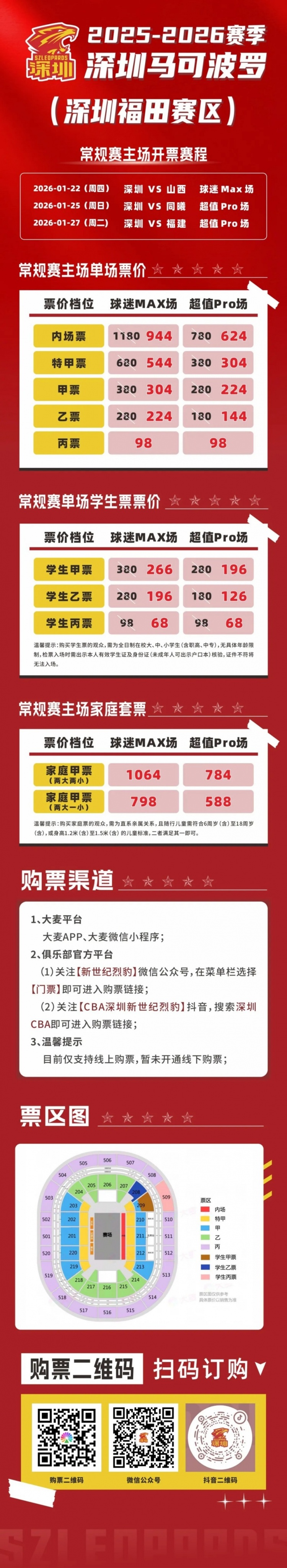 春节前最后一个主场,让我们齐聚深体为深圳马可波罗呐喊助威。球迷朋友可通过大麦APP、大麦微信小程序及本公众号官方渠道购票,锁定现场观赛席位。