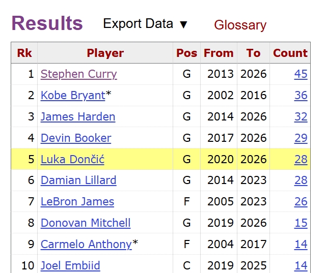 01月27日讯 湖人客战公牛,第三节结束,湖人104-89领先公牛。第三节,东契奇单节个人9中6狂轰20分!这是东契奇职业生涯第29次单节20+!超越利拉德,追平布克,并列历史第四!下一位,东契奇将追赶哈登(32次)。单节20+历史TOP10(本场赛前数据):