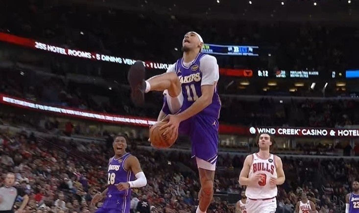 1月27日讯 湖人今日129-118击败公牛,赛后,湖人中锋海斯接受媒体采访。谈到自己反击快攻完成胯下扣篮,海斯表示:“我在NBA比赛中已经做过几次了,其实从中学时期我就在车库用小篮筐尝试各种扣篮,高中二三年级真正能扣篮时就开始练这个动作了。”GIF-海斯反击胯下暴扣