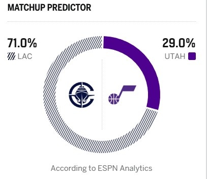 1月27日讯 明天上午11:00,快船客场挑战爵士。今日ESPN给出本场胜率预测,快船高达71.0%,爵士为29.0%。目前快船21胜24负排名西部第十,距离第九的开拓者近1个胜场;爵士15胜31负排名西部第十三。