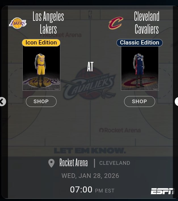 1月27日讯 北京时间1月29日早8点,骑士将在主场迎战湖人。本场比赛将是湖人前锋詹姆斯重返克利夫兰的焦点一战,ESPN将对比赛进行全美直播。根据赛前安排,骑士将在本场比赛使用海军蓝经典复古球衣出战,这也是詹姆斯第一段骑士生涯取得两连MVP时的经典战袍之一。此外,本场骑士也将使用配套的传统复古球场地板涂装。湖人本场比赛也将使用经典传统金色球衣出战。