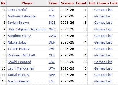 1月27日讯 NBA常规赛,湖人129-118击败公牛。算上本场比赛,东契奇在本赛季已经第8次得到上40,越过安东尼·爱德华兹(7次),独居联盟第一。本场东契奇发挥出色,出战38分04秒,25中15,其中三分14中8,罚球12中8,得到46分7篮板11助攻,正负值+6。以下为本赛季单场得分40+次数的前10榜单(网站最新数据今日还未更新):