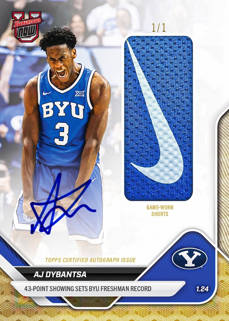 1月27日讯 在前天的一场NCAA比赛中,杨百翰大学91-78击败犹他大学。状元热门AJ·迪班萨出战36分钟,投篮24中15,三分5中4,罚球10中9,砍下43分6篮板3助攻1盖帽。球星卡Topps官方社媒表示:“迪班萨在砍下43分那场比赛所穿球裤上的Nike Swoosh Logo已经被裁剪下来,制作成了一张1-of-1的亲笔签名球星卡。”