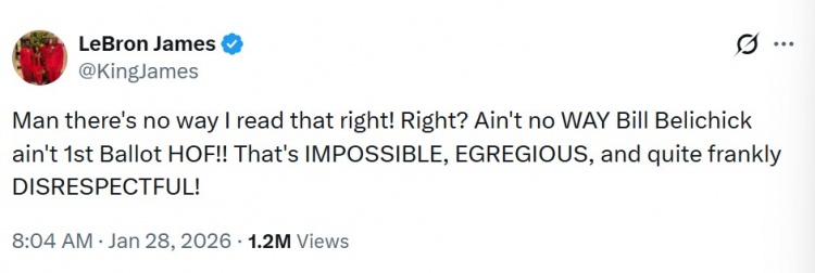 1月28日讯 今天,NFL传奇主教练比尔·贝利奇克落选NFL首届名人堂。对此,湖人球星詹姆斯更推道:“天哪,我肯定看错了!比尔·贝利奇克怎么可能不是第一轮就入选名人堂?这简直是不可能的,荒谬的,坦白说,这是极大的不尊重!”比尔·贝利奇克在新英格兰爱国者夺得六次超级碗冠军,在纽约巨人队(担任协调员)夺得两次超级碗冠军,其以教练和协调员身份合计赢得的超级碗冠军数达八次,创下历史纪录。去年,72岁的贝利奇克曾因与24岁的女友相恋,引起外界热议。