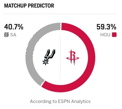 西部第二VS第四焦点战!ESPN预测明日胜率:马刺40.7% 火箭59.3%