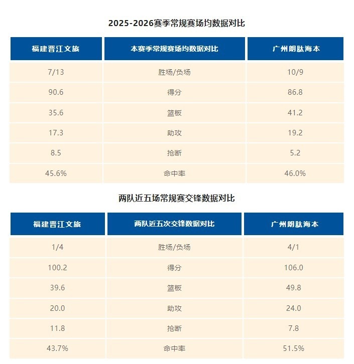 2025-2026CBA联赛第二十一轮,福建晋江文旅男篮客场挑战广州朗肽海本男篮,两队整体数据的博弈成为此战关键看点。主队福建晋江文旅男篮本赛季场均交出90.6分35.6篮板17.3助攻的成绩单,场均8.5次抢断的高压迫防守位列联盟前列,失误控制以场均11.3次展现出不俗的团队配合度。广州朗肽海本男篮则以场均86.8分41.1篮板19.2助攻的表现位列联赛中游,其中场均41.1次的篮板位列联赛前列,场均3.8次盖帽的内线护框也是其优势。本赛季两队首次交锋中,主队晋江文旅男篮三分线上33中14,凭借着42.4%的外线火力爆发与多点开花的团队表现,最终以97-84大胜对手。