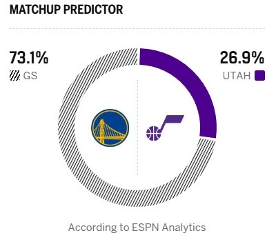 1月28日讯 明天上午10:00,勇士客场挑战爵士。ESPN晒出本场胜率预测,勇士高达73.1%,爵士仅26.9%。目前勇士26胜22负排名西部第八,爵士15胜32分位居西部第十三。伤病方面,勇士球员库里(右髌股关节炎症)、德雷蒙德·格林(左下背部酸痛)、加里·佩顿二世(右小腿挫伤)大概率(75%出战概率)出战比赛。