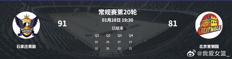 石家庄英励 91-81 北京首钢园,艾米莉·波特23分10篮板砍下两双,王丽丽20分7篮板4助攻5抢断数据全面,凯拉·戴维斯18分。北京女篮郑茗22分,爱丽丝·库内克17分5篮板,凯·詹姆斯15分8篮板,李一凡10分5篮板。