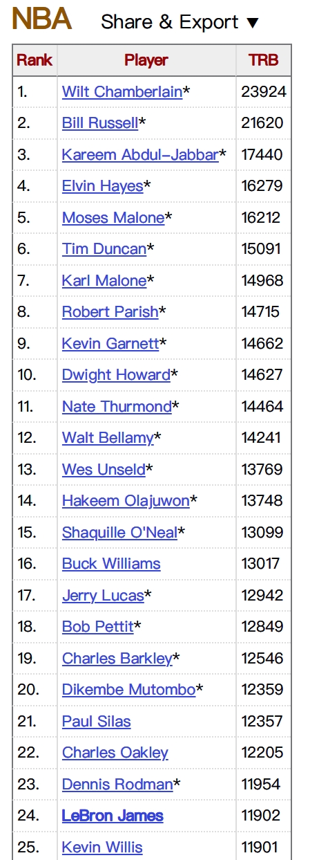 01月29日讯 今日NBA常规赛,湖人99-129客场不敌骑士。本场比赛,詹姆斯上场27分钟,10投3中得到11分3篮板5助攻。至此,詹姆斯职业生涯篮板数来到11902个,超越凯文·威利斯,独占历史第24位。詹姆斯距离身前的大虫罗德曼还差52个。