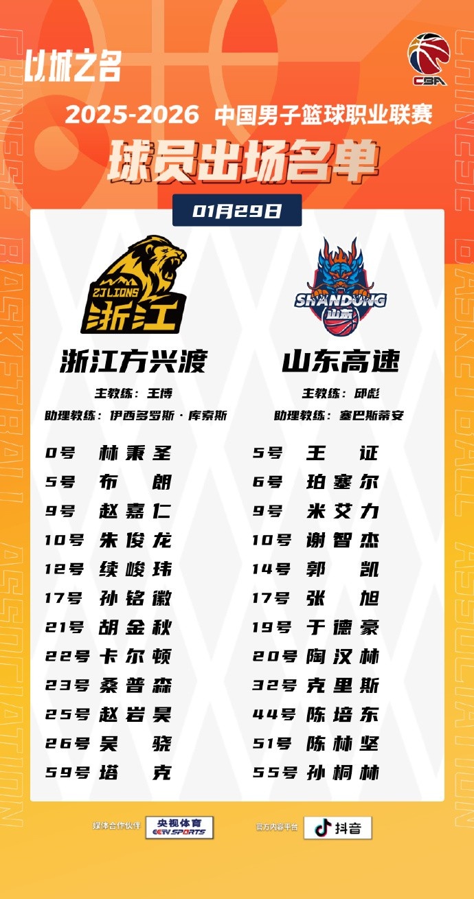 1月29日讯 今晚19:35,CBA常规赛焦点战,广厦对阵山东。赛前双方公布了本场比赛的大名单。广厦:林秉圣、布朗、赵嘉仁、朱俊龙、续峻玮、孙铭徽、胡金秋、卡尔顿、桑普森、赵岩昊、吴骁、塔克。山东:王证、珀塞尔、米艾力、谢智杰、郭凯、张旭、于德豪、陶汉林、克里斯、陈培东、陈林坚、孙桐林。