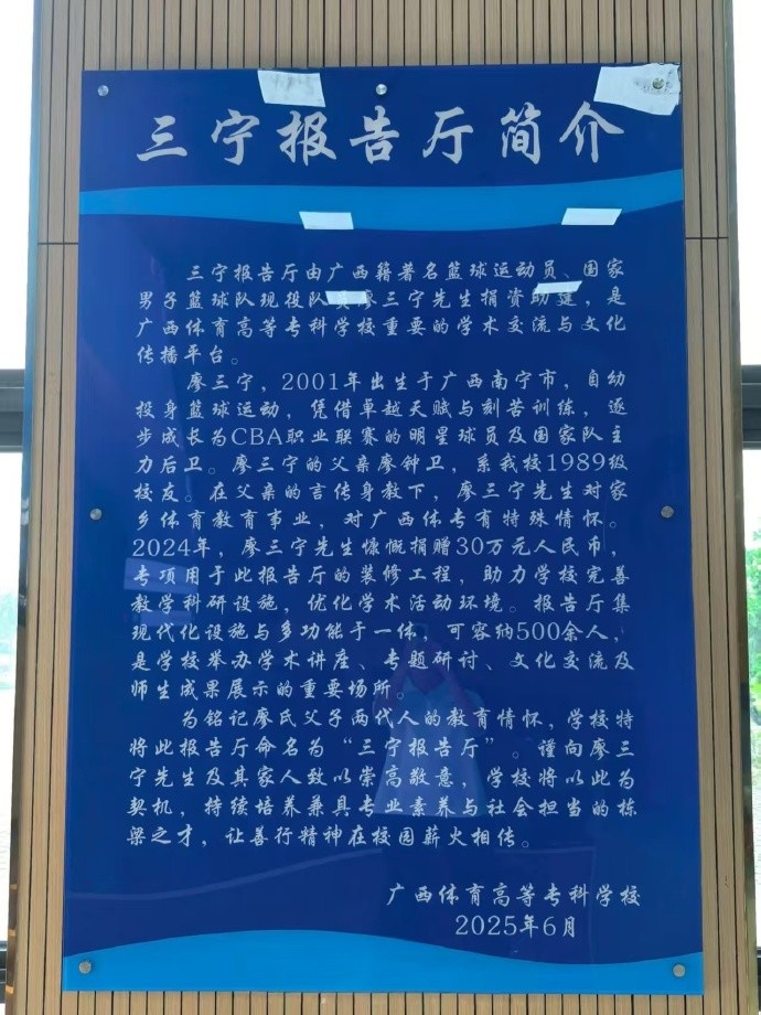 1月30日讯 据广西体育高等专科学校消息,广西籍、北控男篮球员廖三宁此前向该校捐赠了30万元。
