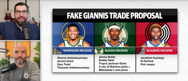 01月31日讯 雅虎名记Kevin O'Connor提出了一个涉及三方的模拟交易。具体如下:勇士得到:字母哥、字母哥哥、格兰特、特伦特;雄鹿得到:巴特勒、希尔德、TJD、勇士首轮签、雄鹿自己的首轮签(来自开拓者);开拓者得到:库明加、霍福德 、首轮互换。