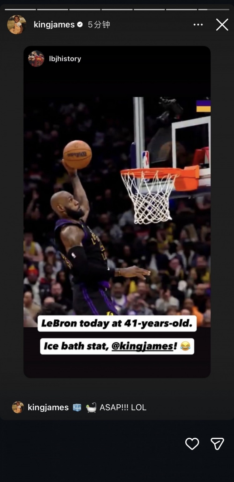 詹姆斯转发了他本场多次扣篮的精彩集锦,并评论道:“要尽快泡冰水浴了