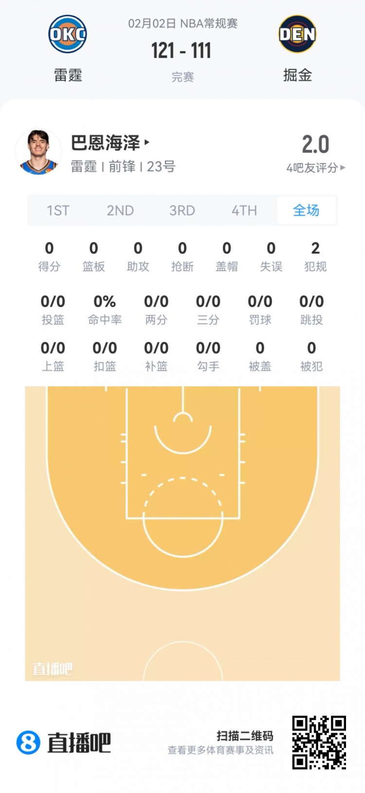 雷霆次轮44号秀巴恩海泽 登场2.6分钟