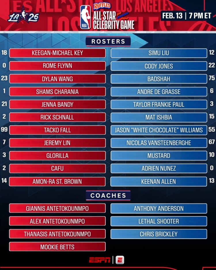 2月4日讯 NBA官方公布了2026洛杉矶全明星名人赛的比赛名单。其中包括艺人王鹤棣、还有退役球星林书豪、以及知名记者Shams等人。