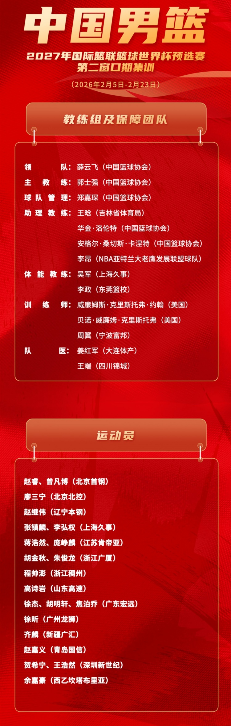 为备战国际篮联2027篮球世界杯预选赛第二窗口期比赛,中国篮球协会计划于2月5日至2月23日在国家体育总局训练局组织国家男篮集训。中国篮协于今日公布了本次男篮集训大名单,我俱乐部球员贺希宁和王浩然入选,祝愿他们在国家队集训中不断突破,为国争光。中国男篮在2月5日集中后开展集训备战工作,计划于2月23日抵达日本冲绳进行最后的适应训练,调整比赛状态。中国男篮将于2月26日对阵日本男篮,于3月1日对阵中国台北男篮。