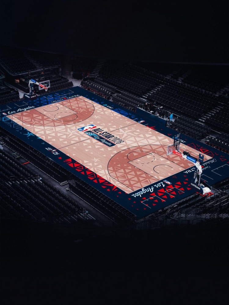 这块全明星赛地板的设计灵感来自洛杉矶这座城市,以及全新的美国队VS世界队赛制,旨在致敬这座城市深厚的篮球历史与NBA的全球影响力。