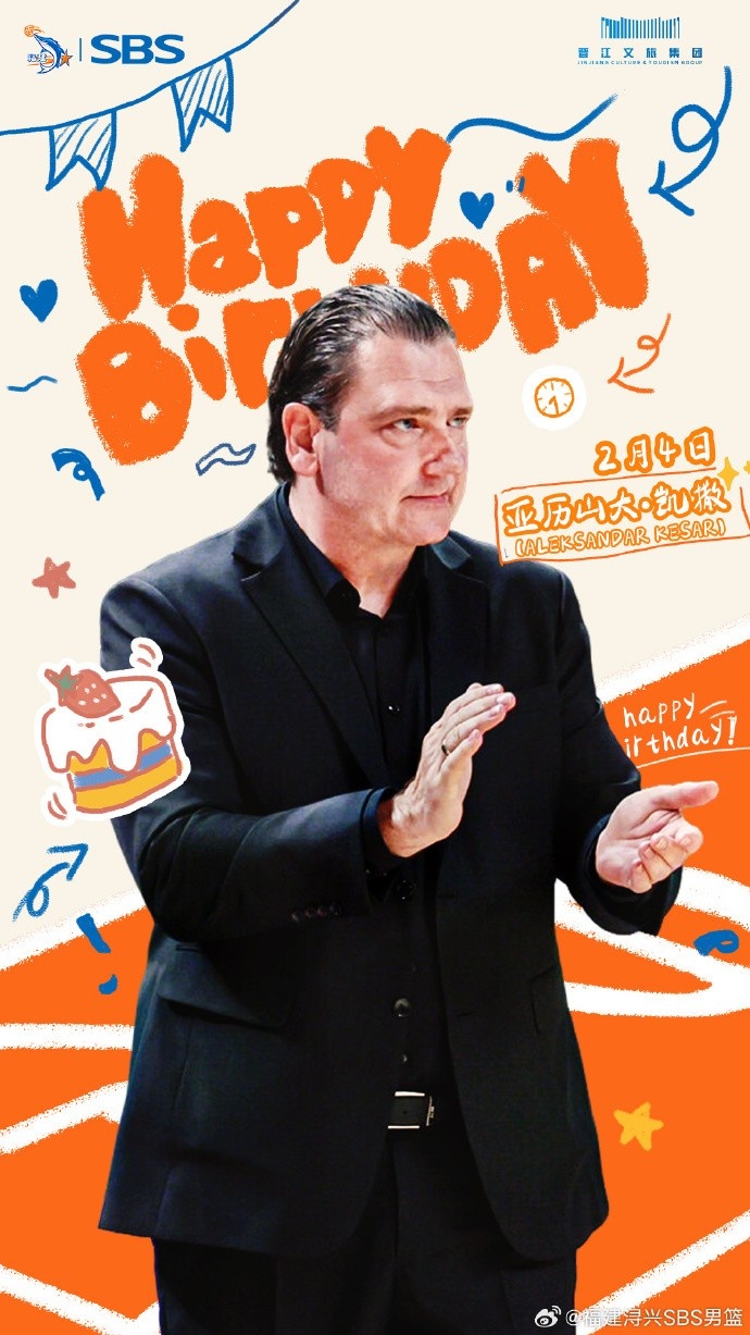 今天是主教练亚历山大·凯撒(ALEKSANDAR KESAR)的生日,让我们一起祝福他生日快乐!亚历山大·凯撒作为塞尔维亚功勋级教练员,曾先后在2013-2022赛季间的CBA联赛中担任过山东男篮、福建男篮、天津男篮主教练。2019-2020赛季,凯撒中途接任福建男篮主教练,在率队取得11胜6负的成绩后,以第十二的排名带队成功杀入季后赛,并在季后赛十二进八的单场淘汰赛中力克浙江广厦男篮,上演“黑十二”奇迹。上赛季凯撒教练中途担任福建晋江文旅男篮主教练至赛季结束,率队先后战胜江苏男篮、新疆男篮,双杀四川男篮,为主队注入了韧性以及活力。本赛季凯撒教练继续执教主队,在第一阶段带领球队取得8胜15负的战绩,希望凯撒教练带领主队在本赛季第二阶段取得更好的成绩,为球迷呈现更加精彩的比赛!