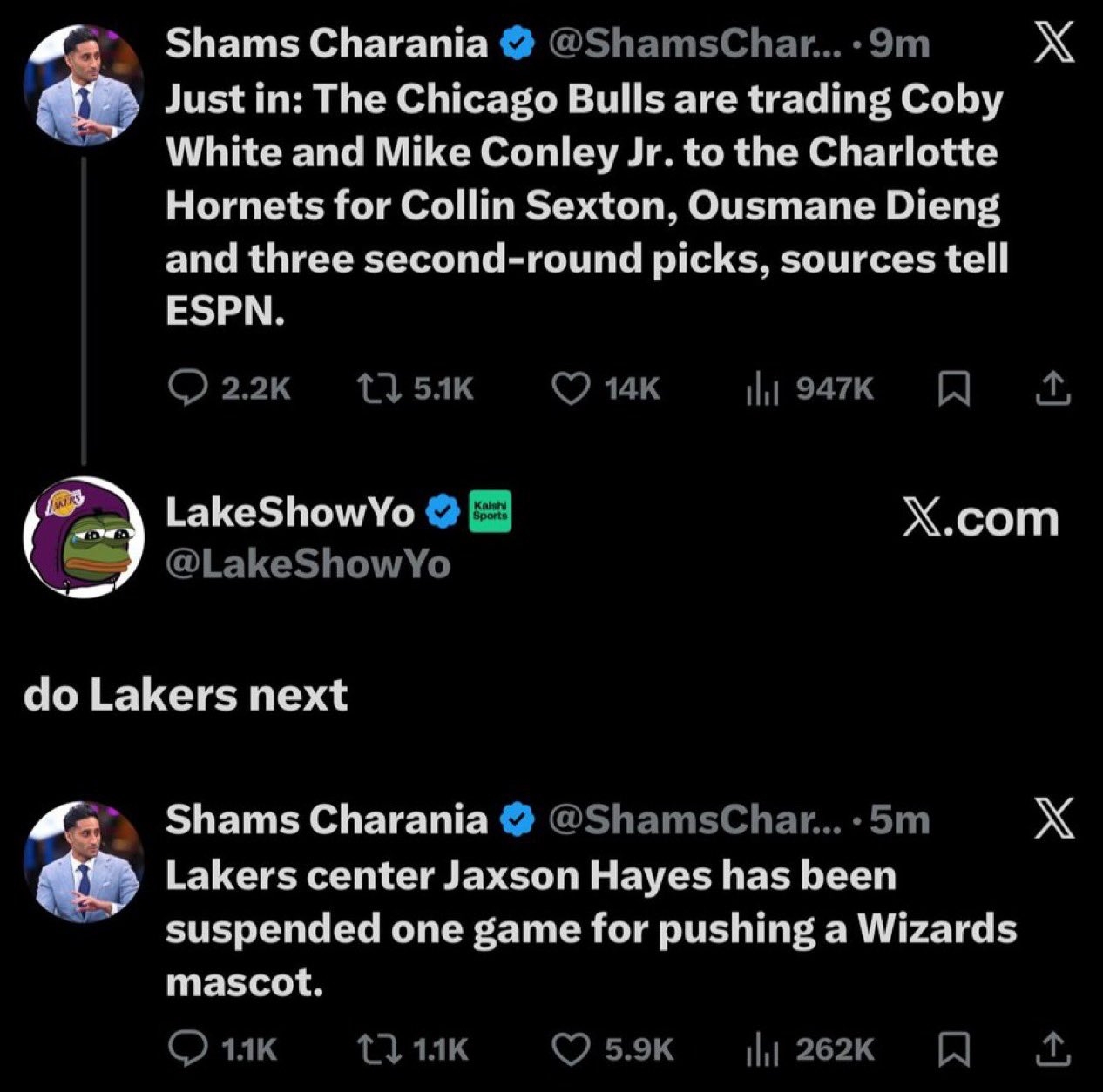 交易截止日临近,市场情绪升温,名记Shams颇为活跃。在爆料科比·怀特的交易后,知名湖人自媒体LakeShowYo在评论中“哀求”:“接下来能不能搞点我湖的料!”Shams也是有求必应,在五分钟后报道了湖人中锋海斯被禁赛一场的消息