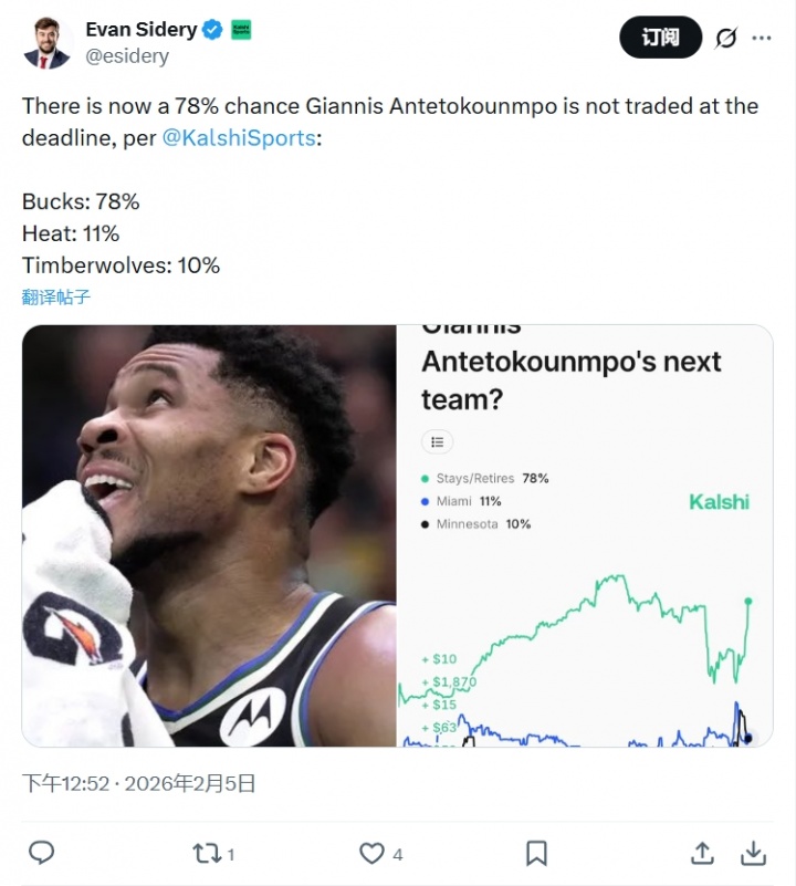 02月05日讯 Shams报道,勇士用库明加+希尔德交易得到波津。Siegel后续跟进,雄鹿拒绝了勇士给字母哥的报价,勇士转而追求波津。美媒Kalshi Sports晒字母哥去向概率,留在雄鹿目前高达78%,去热火11%,去森林狼10%。