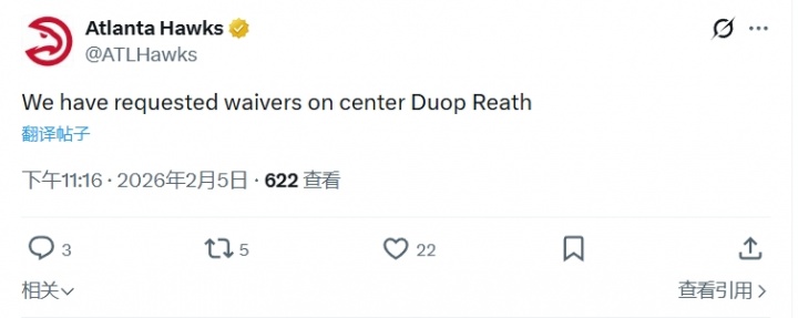 02月05日讯 今日,老鹰官方宣布已裁掉球队中锋杜普·里斯。此前,里斯因右脚应力性骨折赛季报销。近日,据ESPN名记Shams报道,老鹰将克雷伊奇送至开拓者,换回里斯与两个次轮签!本赛季,杜普·里斯出战32场,场均得到2.9分1.2篮板0.3助攻0.2抢断0.3封盖。1月30日,他成功接受右脚应力性骨折手术,赛季报销!