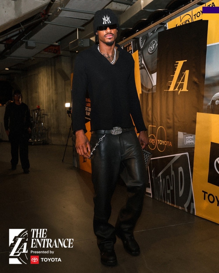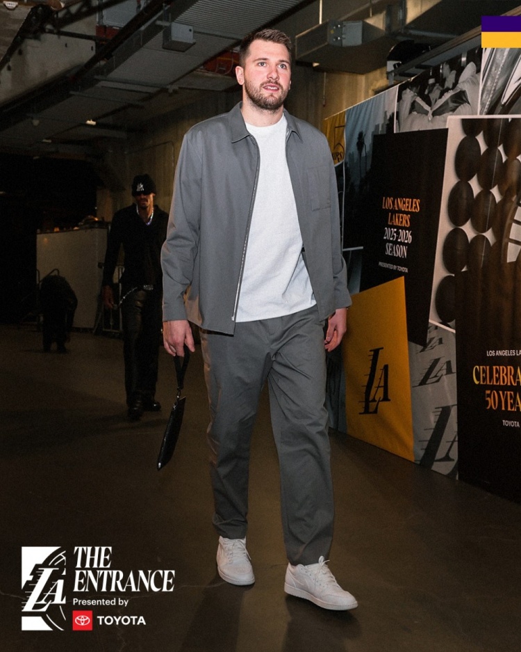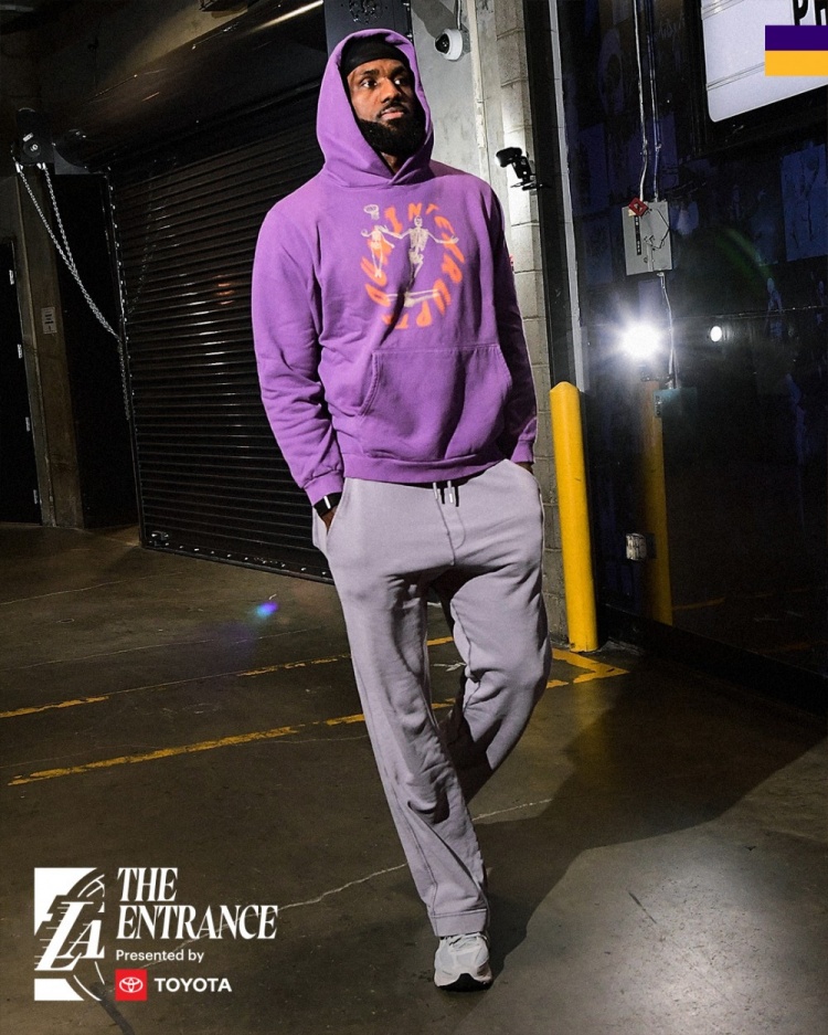 湖人入场穿搭:詹姆斯紫色连帽衫秀詹韦连线元素 东契奇灰白搭配