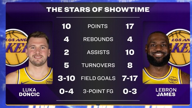 湖人主场119-115险胜76人。赛后,转播方晒出詹姆斯和东契奇本场的数据,东契奇伤退只打了16分钟10投3中,三分4中0仅得10分,出现5次失误;詹姆斯得到17分10助攻,但投篮17中7,三分3中0,还出现8次失误。