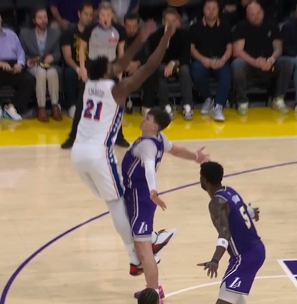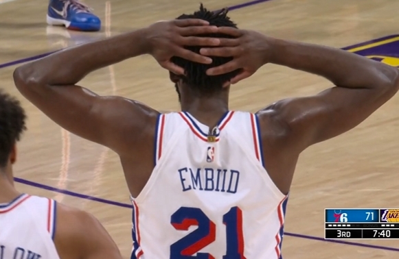 这姿势有点搞笑恩比德诡异姿势造成拉拉维亚投篮犯规