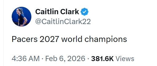 2月6日讯 此前,步行者送出马瑟林、以赛亚·杰克逊、一个2026年首轮签(前4保护、20-30保护)、一个2029年首轮签(无保护)和一个2028年次轮签,从快船换来祖巴茨和科比·布朗。效力于印第安纳狂热的球星凯特琳·克拉克更推道:“步行者2027年将会夺冠。”