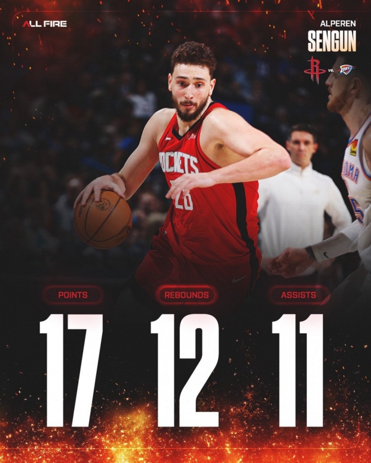 2月8日讯 NBA常规赛,火箭112-106战胜雷霆。赛后,火箭发布了申京、小贾巴里·史密斯和伊森三位球员本场的数据海报。其中申京砍下17分12篮板11助攻的三双,小贾砍下22分10篮板,伊森26分8篮板。