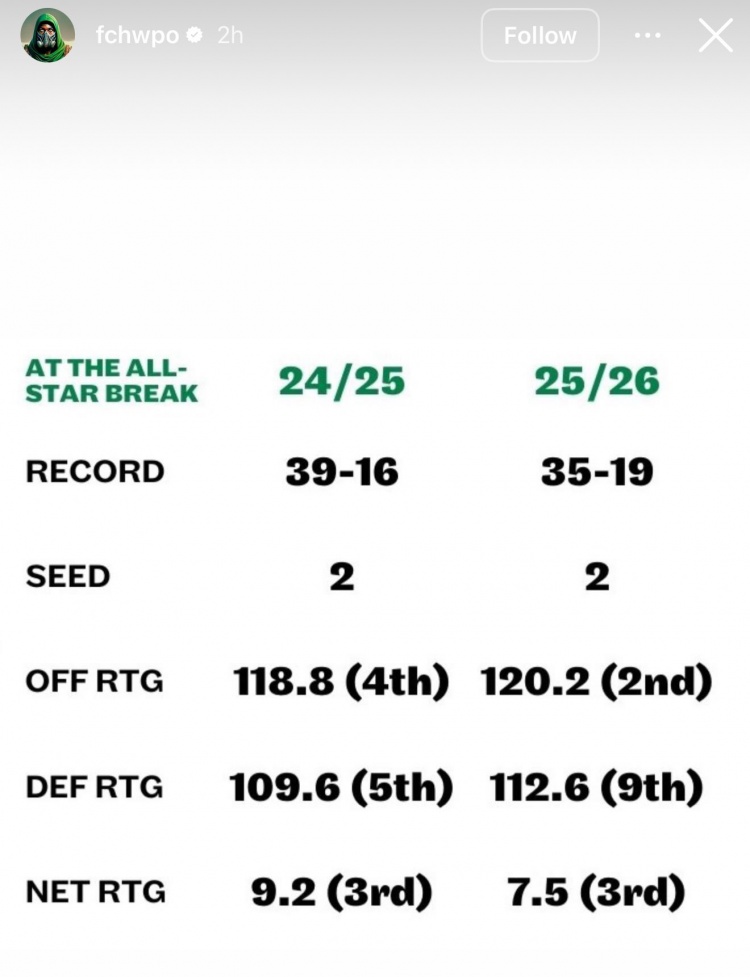 2月13日讯 今日,凯尔特人前锋杰伦·布朗更新Instagram Story动态。布朗晒出上赛季和本赛季凯尔特人在全明星假期时的战绩和各项数据对比。24-25赛季:39胜16负,东部第二,进攻效率118.8(第4),防守效率109.6(第5),净效值9.2(第3)25-26赛季:35胜19负,东部第二,进攻效率120.2(第2),防守效率112.6(第9),净效值7.5(第3)