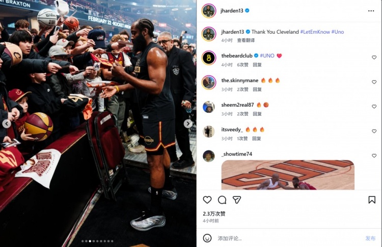 2月13日讯 昨日NBA常规赛,骑士138-113战胜奇才。今天哈登更新INS晒出昨日赛前和赛场瞬间,写道:“感谢克利夫兰 #让大家都知道 #Uno”本场比赛,哈登全场出战28分钟,4投1中,三分4投1中,罚球12罚10中,得到13分4篮板11助攻1盖帽。背景文字:骑士主场欢迎新援哈登、施罗德和基翁·埃利斯